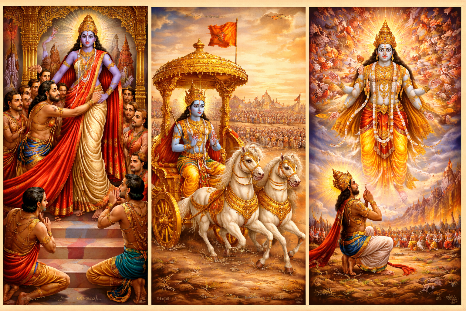 Years later, on the battlefield of Kurukshetra, Arjuna was torn between duty and compassion. Lord Krishna delivered the sacred Bhagavad Gita, revealing profound truths about dharma, karma, and devotion. This divine discourse became one of humanity’s greatest spiritual guides.