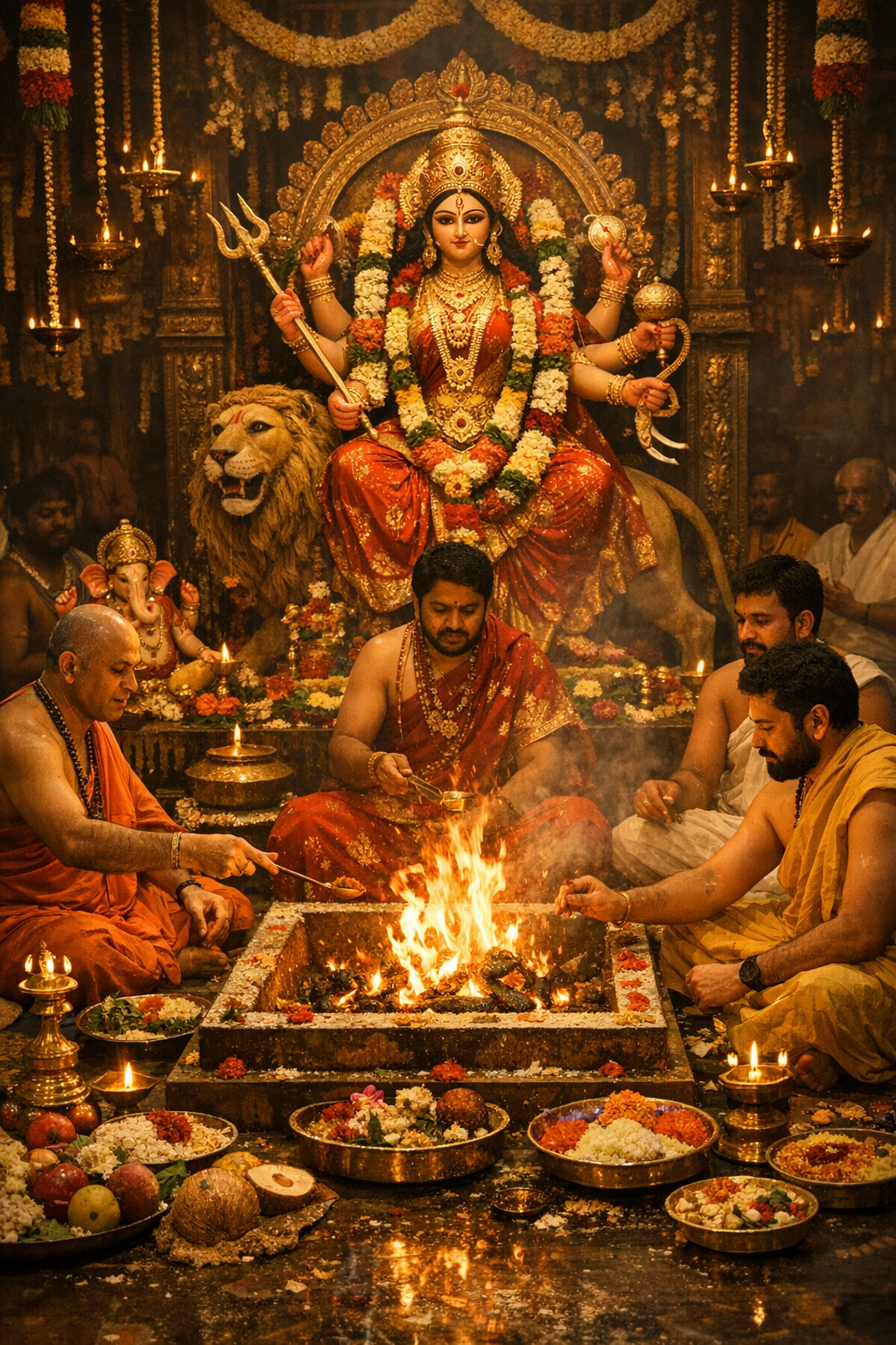 Chandi Homa is a powerful Vedic fire ritual dedicated to Goddess Chandi, a fierce form of Goddess Durga. This sacred ceremony invokes the divine blessings of Chandi for protection, strength, and the removal of negative forces. The homam involves the recitation of the Chandi Path, a series of hymns from the Devi Mahatmya, along with offerings to the sacred fire. Chandi Homam is believed to bring immense spiritual power, prosperity, and the fulfillment of desires. It is especially beneficial during times of conflict, challenges, or when seeking victory over obstacles. This ritual enhances inner strength, courage, and divine grace.