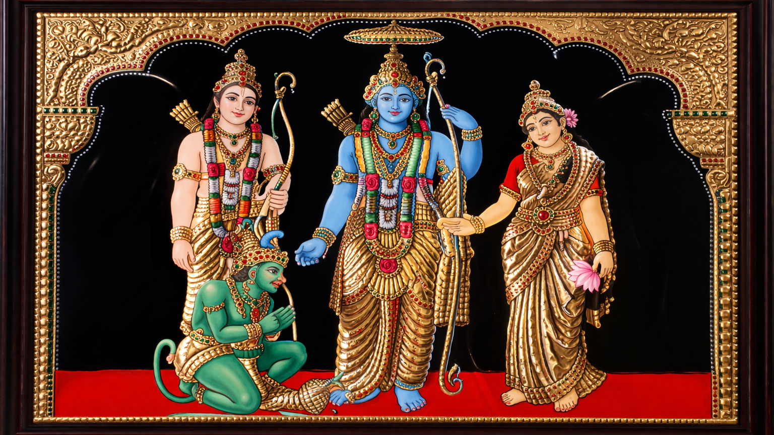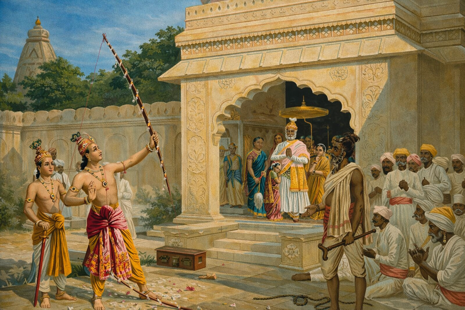 Princess Sita’s hand would go to whoever could lift Lord Shiva’s mighty bow. Rama alone succeeded, breaking it effortlessly. Sita garlanded him, marking their divine union.
